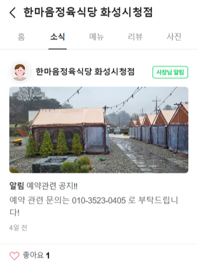 지난 일요일 화성시청 근처의 캠핑 식당이 새로 열었다는 소식을 듣고 한마음 정육식당 화성시청점에서 저녁 식사를 하였습니다. 이전에도 이런 컨셉의 식당을 다녀보았을 때 고기 맛이 없다던가 다소 지저분하다던가 또는 아이들이 놀기에 적합하지 않은 놀이방이 있으면 조금 불편하다고 생각하고 있었는데, 나오면서 간판 모서리에 마음속으로 X 표시하고 나오는 곳도 있었습니다..^^
