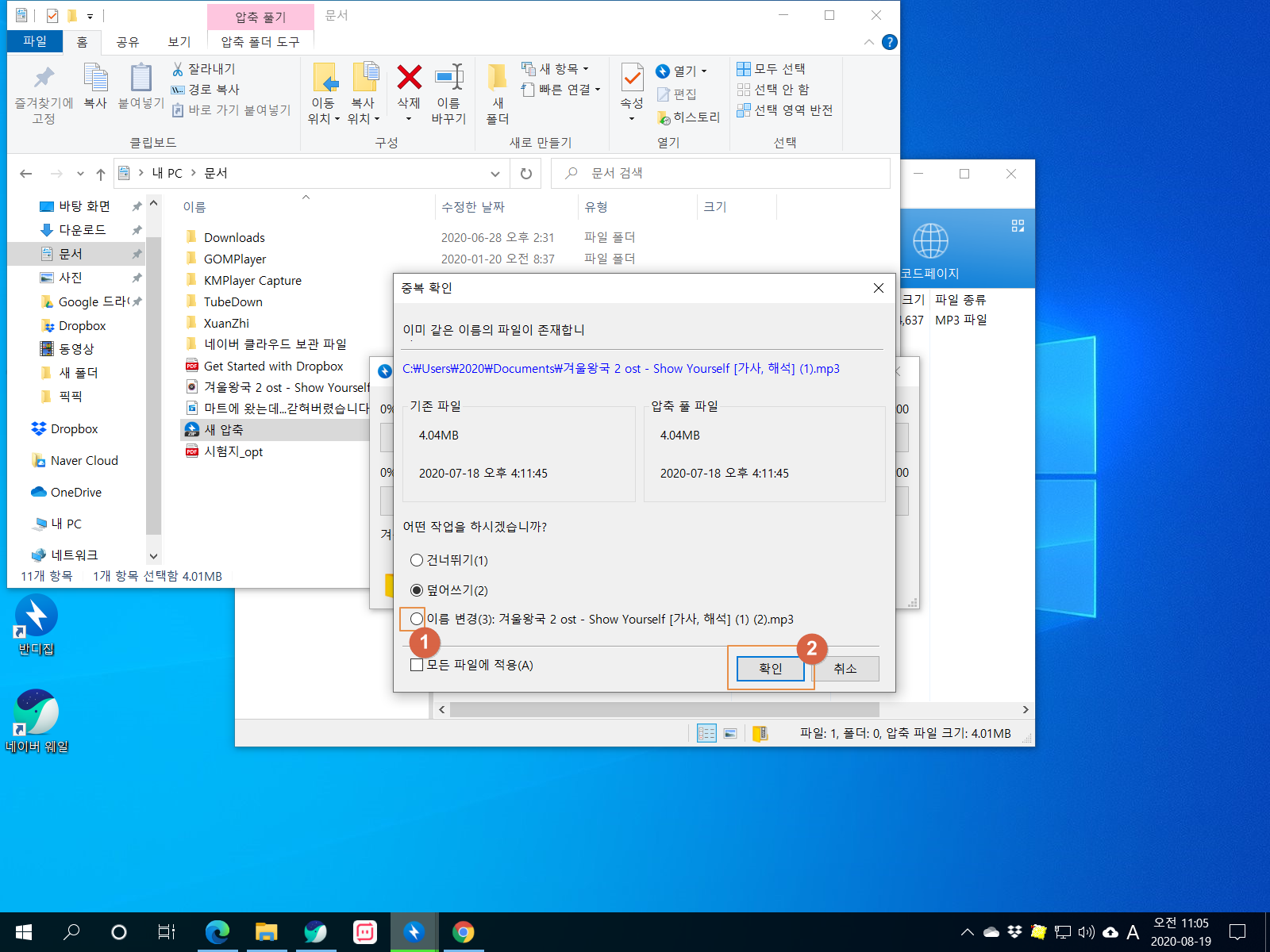 이런 동일한 폴더에 이미 같은 이름의 파일이 있다고 나오네요. 이럴 때 덮어쓰기보다는 이름 변경이 유용합니다. 1번 <이름 변경>에 체크한 후 2번 <확인>을 누릅니다.