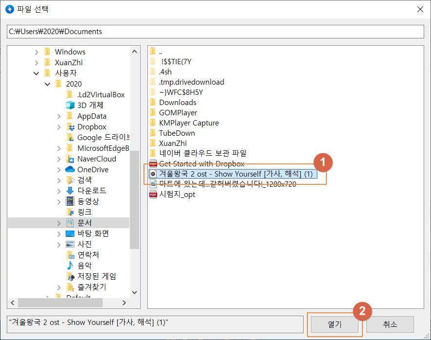 파일 선택 창에서 1번 파일을 선택하고, 2번 <열기>를 누릅니다.