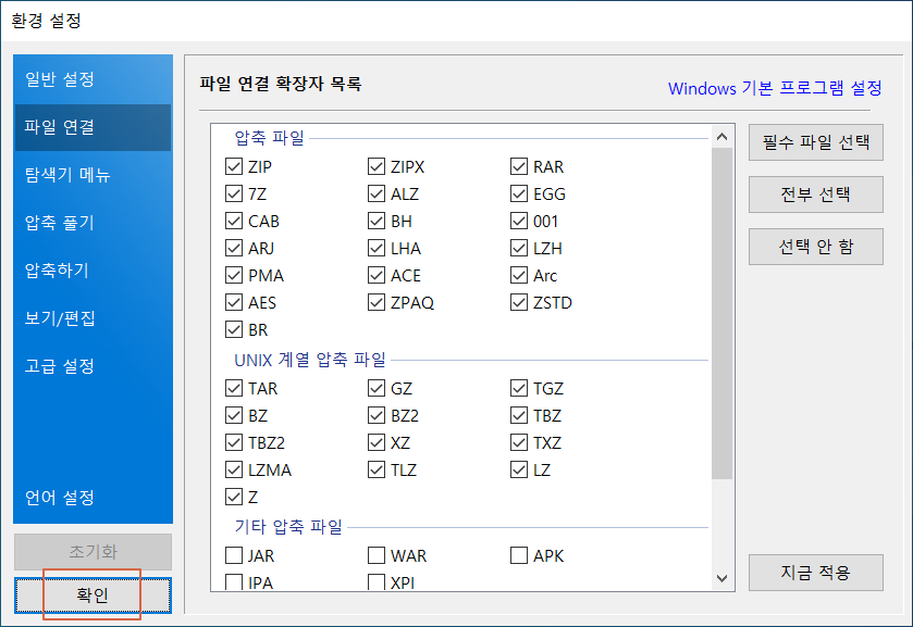 닫기를 누르면 바로 반디집 환경설정이 나타납니다. 파일 연결 확장자를 선택한 후 <확인>을 누릅니다. 대체로 기본적인 설정으로 사용하시는 걸 권해드립니다.