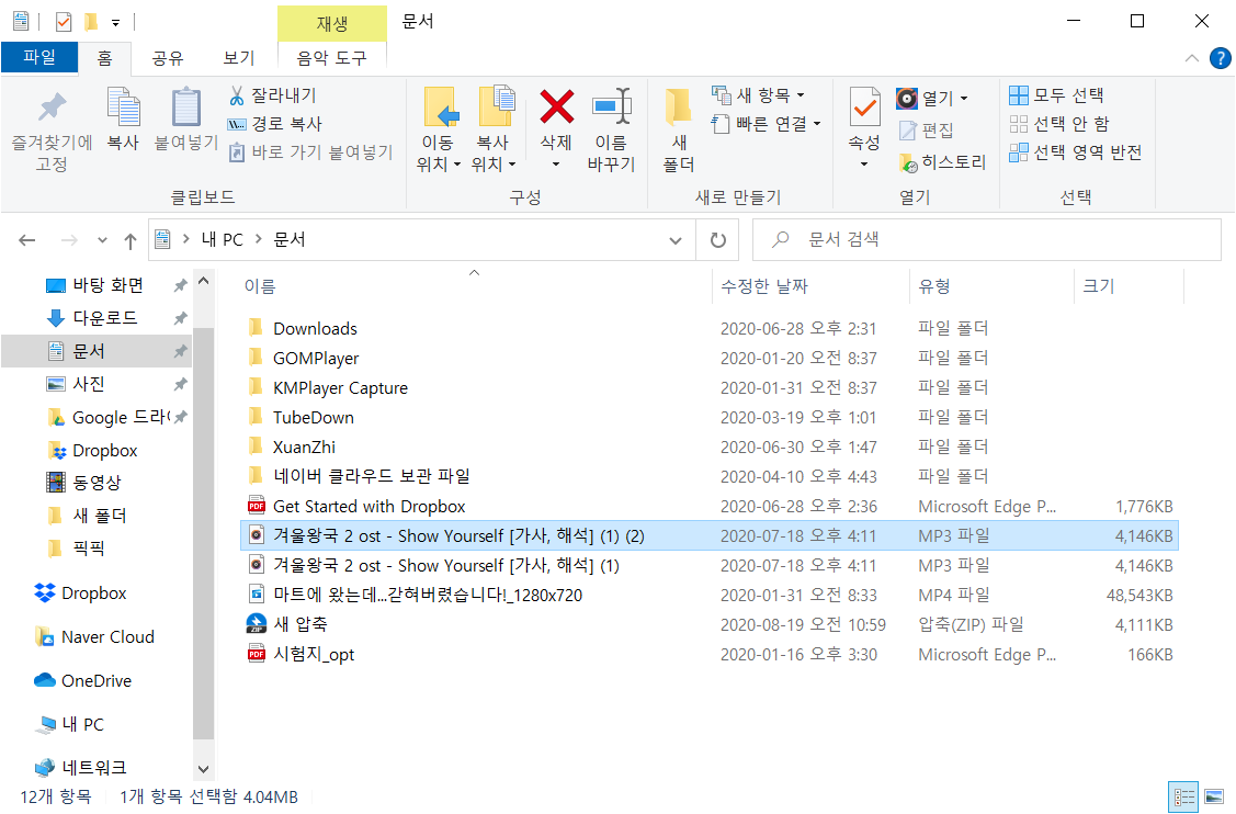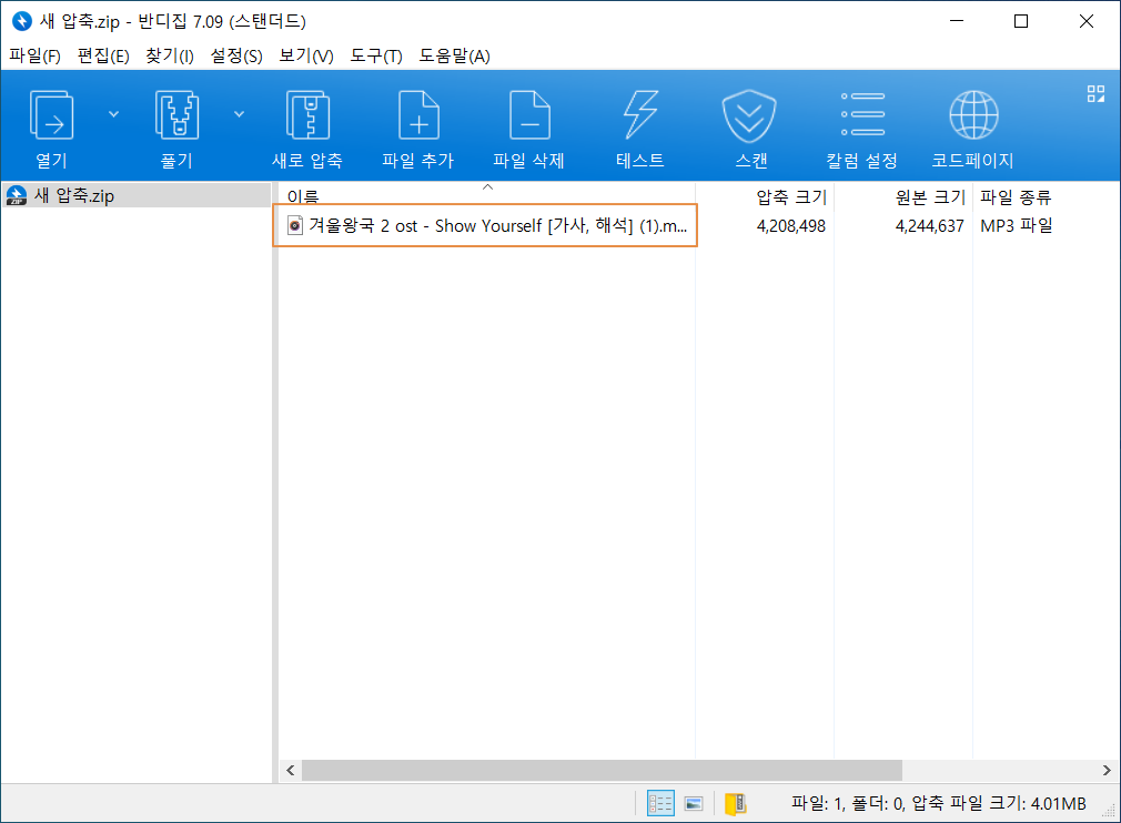 압축된 파일이 보입니다. MP3 음원 파일이라서 이미 압축된 상태라 원본 크기나 압축 크기가 차이가 많이 나지는 않습니다.