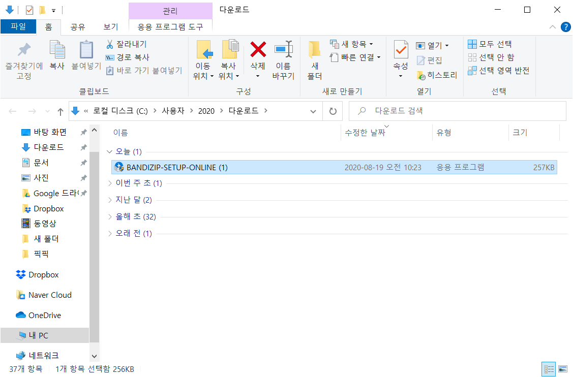 금방 다운로드가 이루어져서 내려받기 폴더로 이동하시면 반디집 설치 파일을 볼 수 있습니다. 설치 파일을 실행합니다.