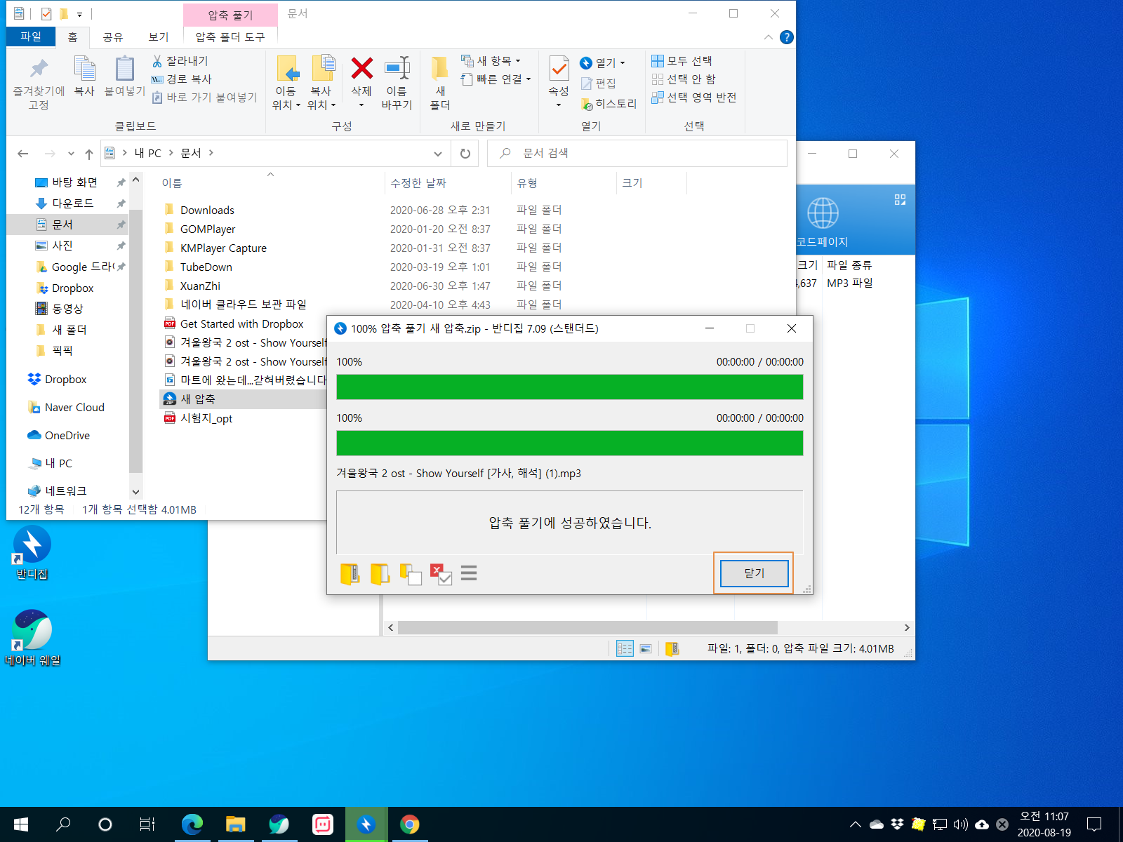 압축 풀기에 성공하였습니다. <닫기>를 누릅니다.