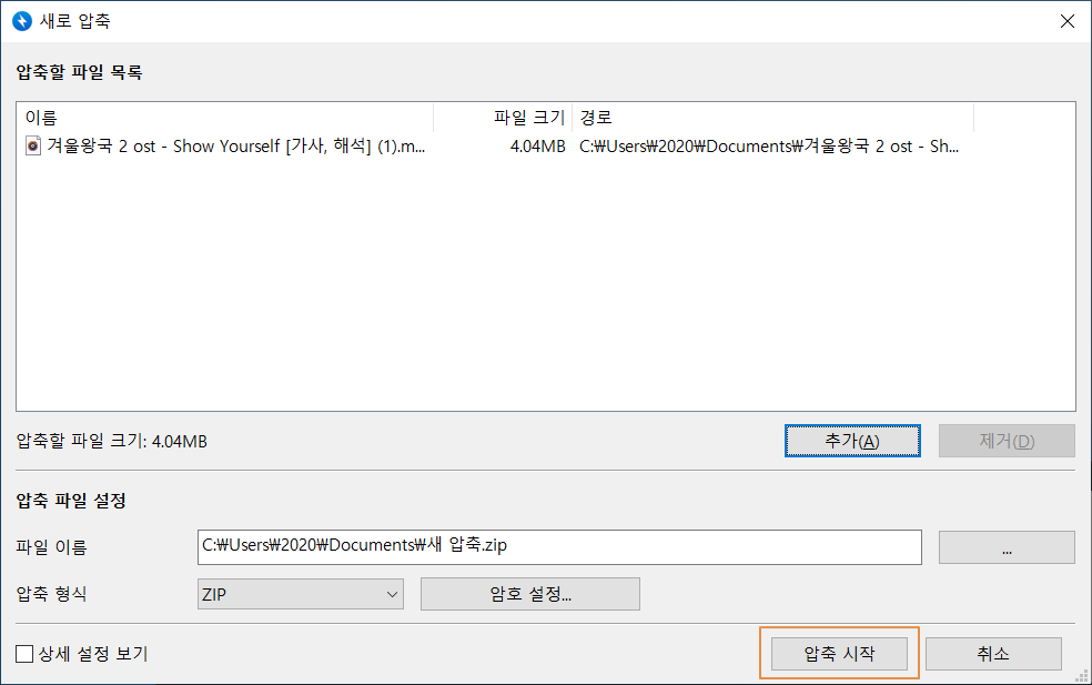 하지만 지금은 테스트이므로 그냥 <압축 시작>을 누르도록 하겠습니다.