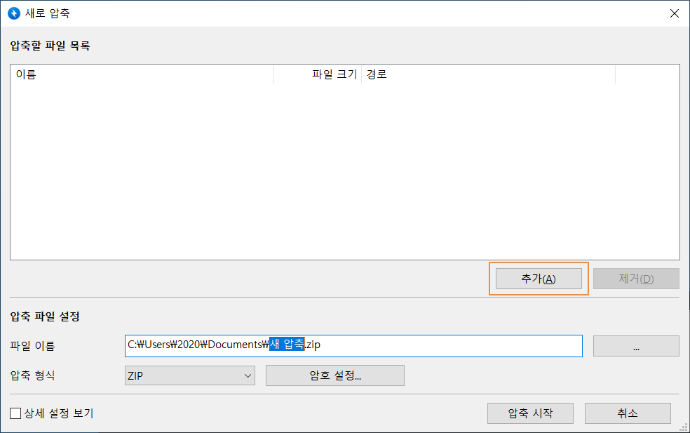 새로 압축 창이 열리면 <추가>를 누릅니다.