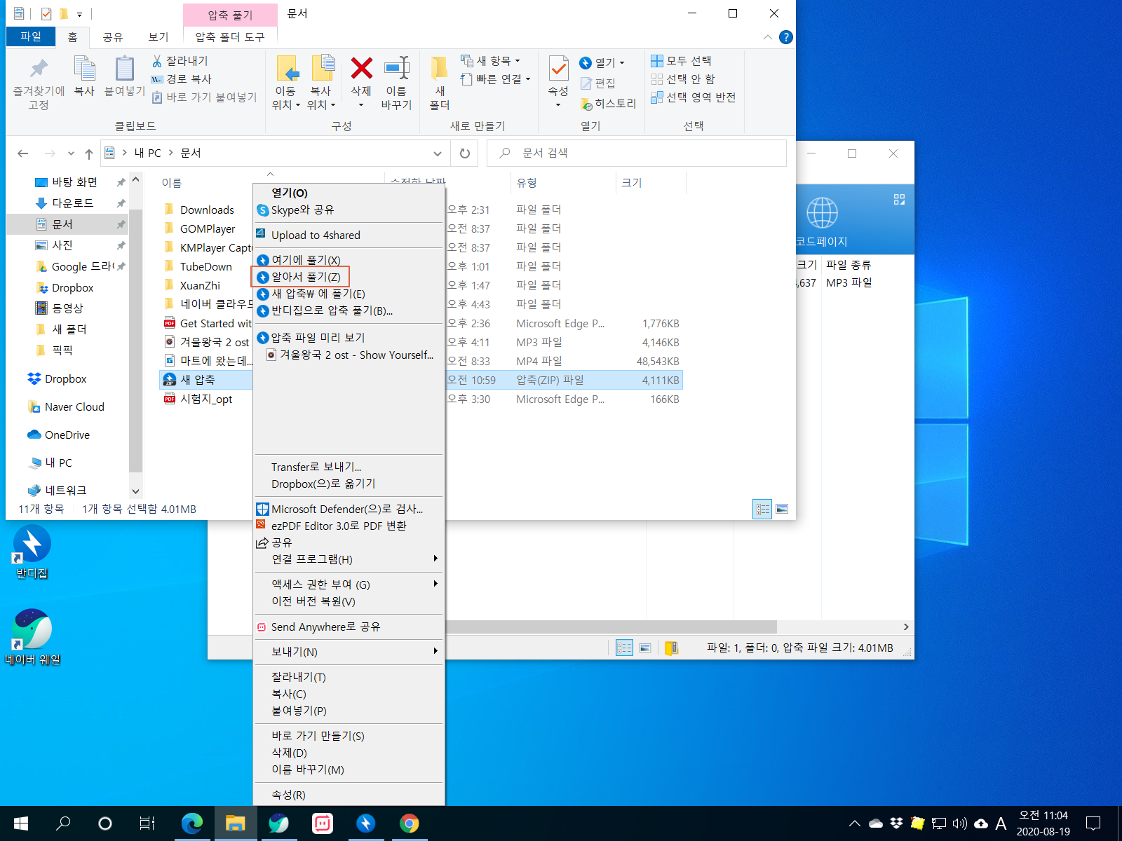 이번엔 위에서 압축했던 파일을 압축 풀기 또는 압축 해제를 진행해 보려 합니다. 압축 풀 기할 파일을 선택합니다.