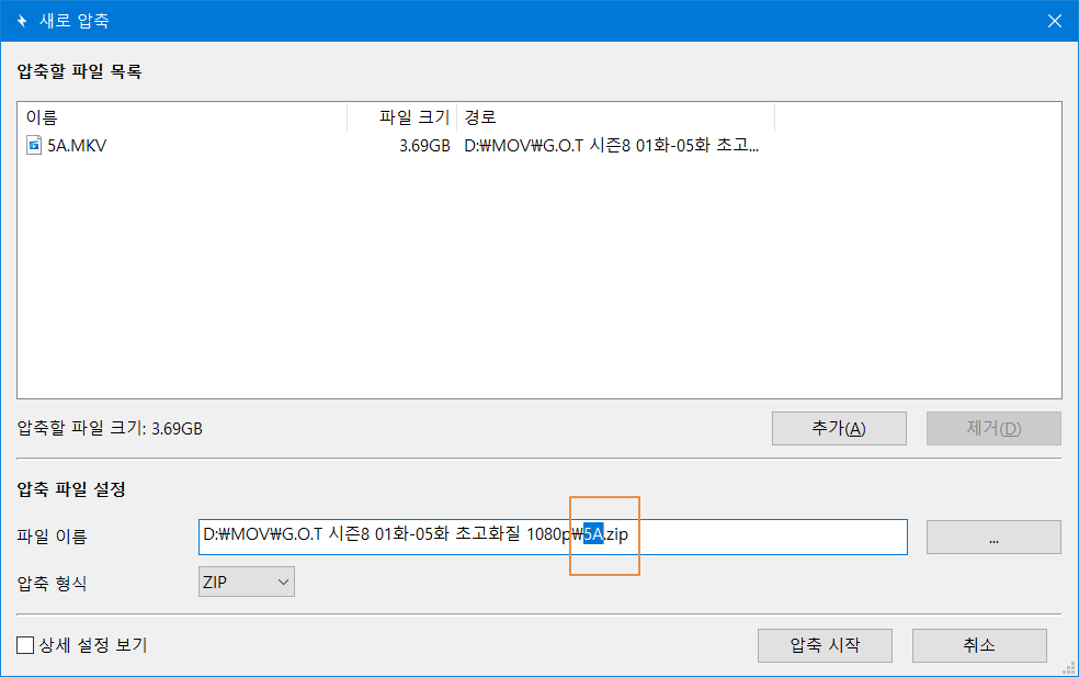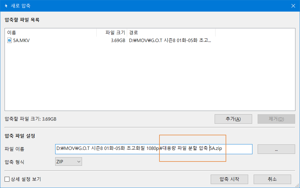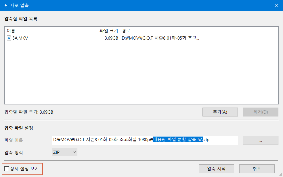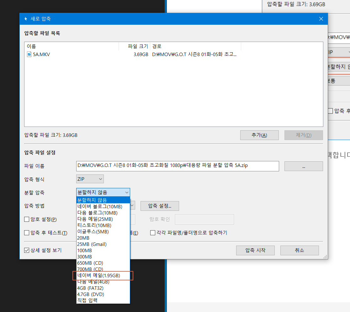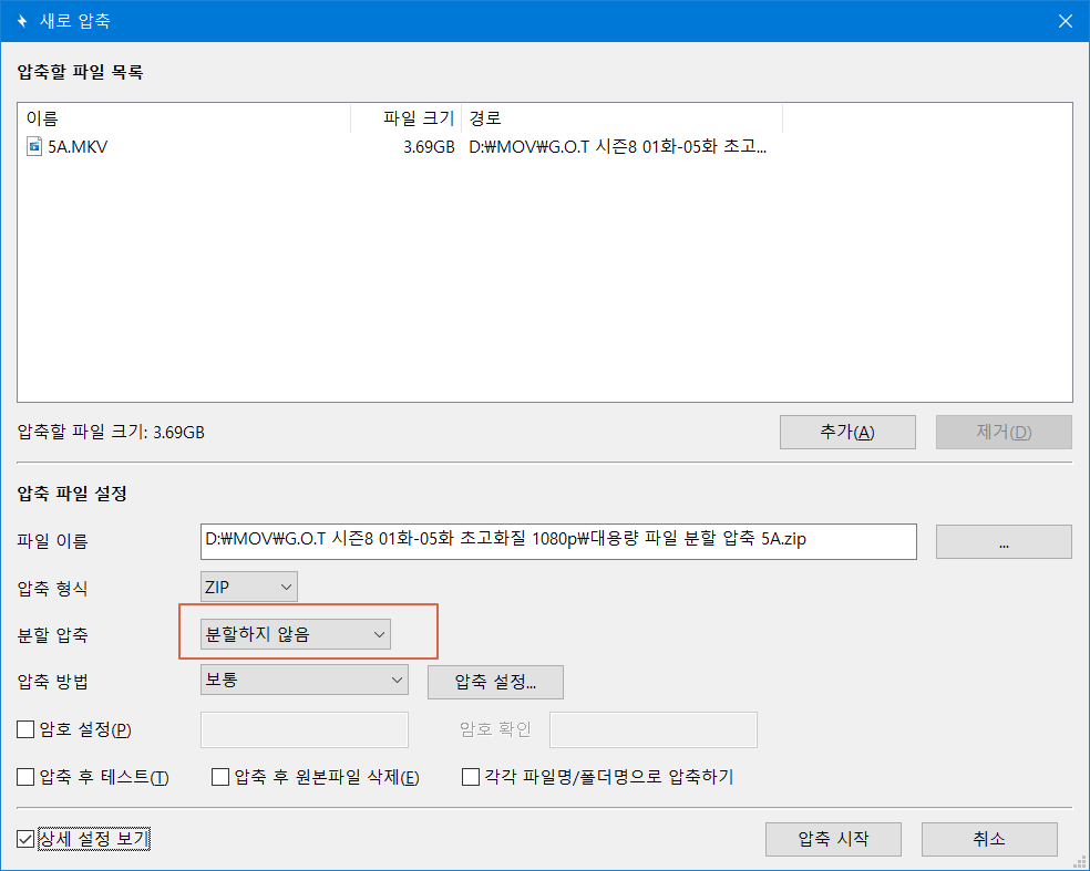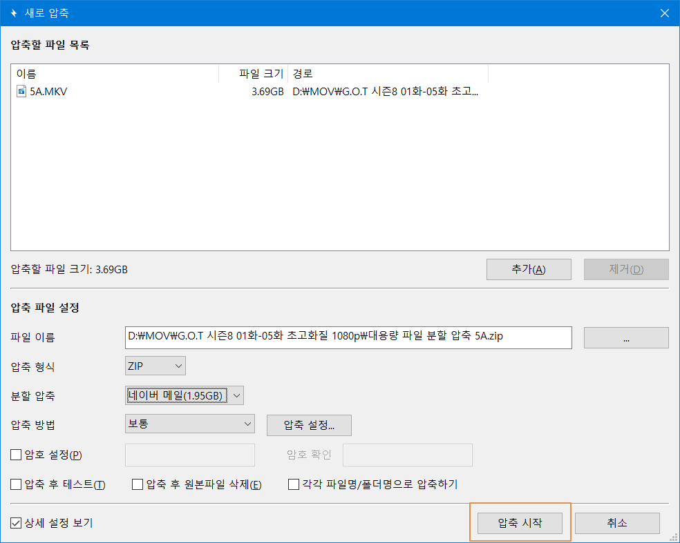 기타 다른 항목들도 선택하여 옵션을 조정해도 되지만 일단 분할 압축만을 확인해 보는관계로 <압축 시작>을 누릅니다.