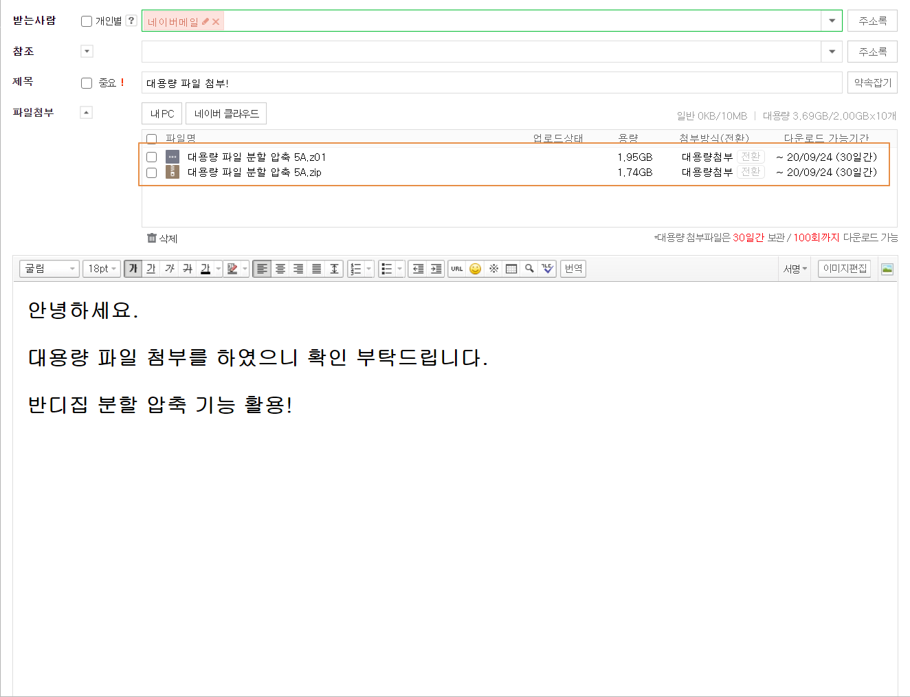 용량이 큰 파일들을 전송하기 위해서는 드롭박스나 구글 드라이브와 같은 클라우스 서비스를 이용할 수도 있지만, 클라우드 서비스 사용이 곤란한 경우 대용량 파일을 분할 압축하여 메일로 첨부하여 보내는 방법을 사용해 볼 수 있습니다.