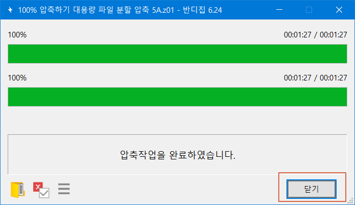 반디집으로 분할 압축이 완료되었습니다. <닫기>를 누릅니다.