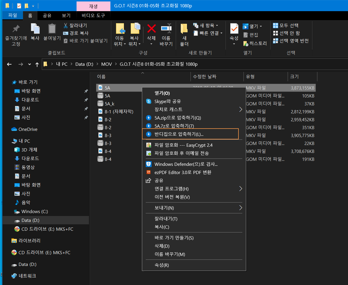 * 분할 압축 기능을 사용하면 압축 파일 및 파일명 뒤에 01, 02, 03, ... 등이 붙은 분할 압축 파일들이 함께 생성됩니다.