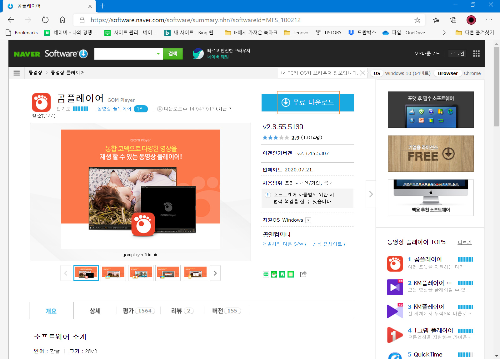 곰플레이어 다운로드 페이지로 이동합니다. <무료 다운로드>를 누릅니다.
