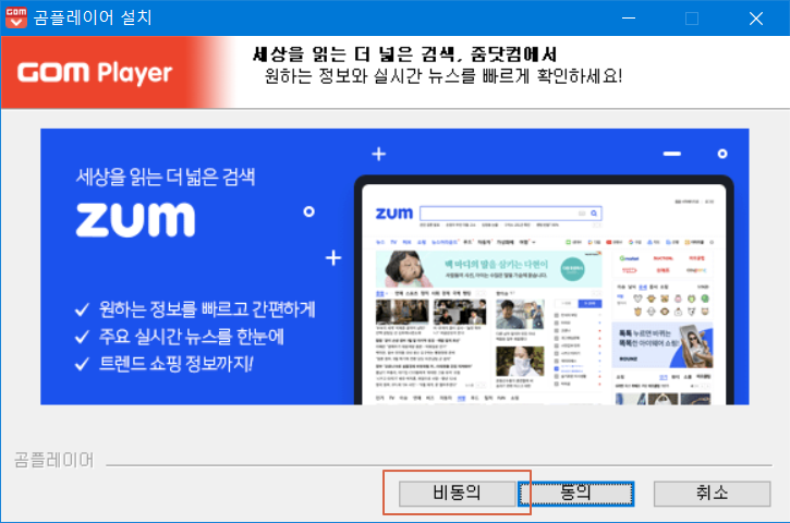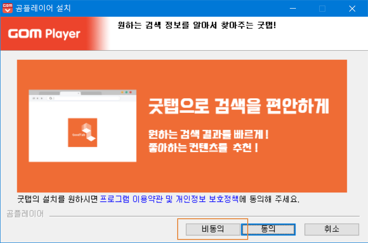 곰플레이어 설치가 우선이기 때문에 <비동의>를 선택합니다. 굿탭은 나중에 확인해서 필요할 시기에 설치를 추천드립니다.