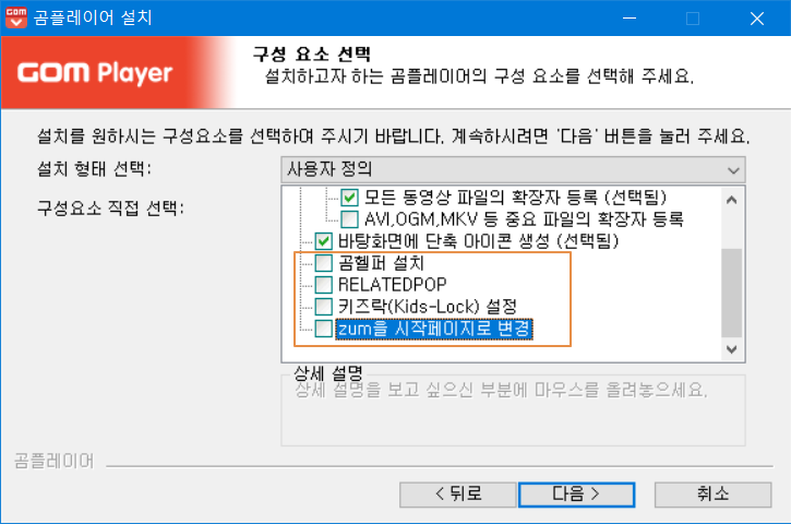 <곰헬퍼 설치>, <RELATEDPOP>, <zum을 시작페이지로 변경>을 체크 해제합니다.