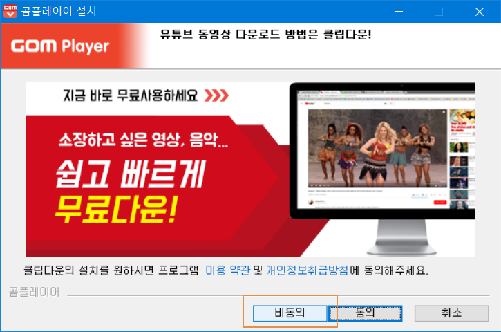클립다운도 유튜브 동영상 다운로드가 가능하여 충분히 좋은 프로그램이긴 하지만 일단 <비동의>를 눌러줍니다.