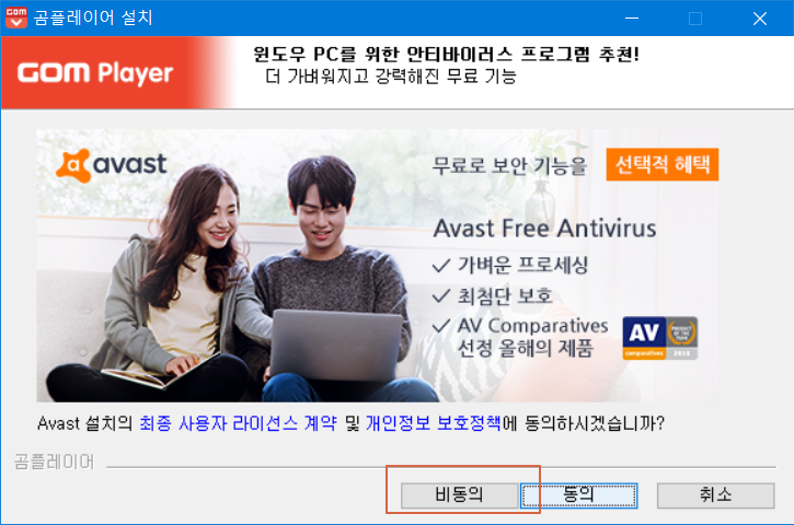 Avast 안티바이러스 프로그램도 충분히 좋은 기능을 가진것은 맞으나 <비동의>를 누릅니다.