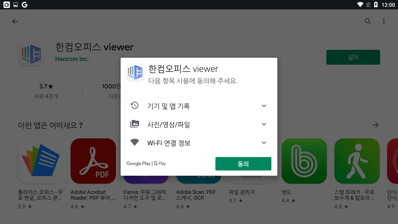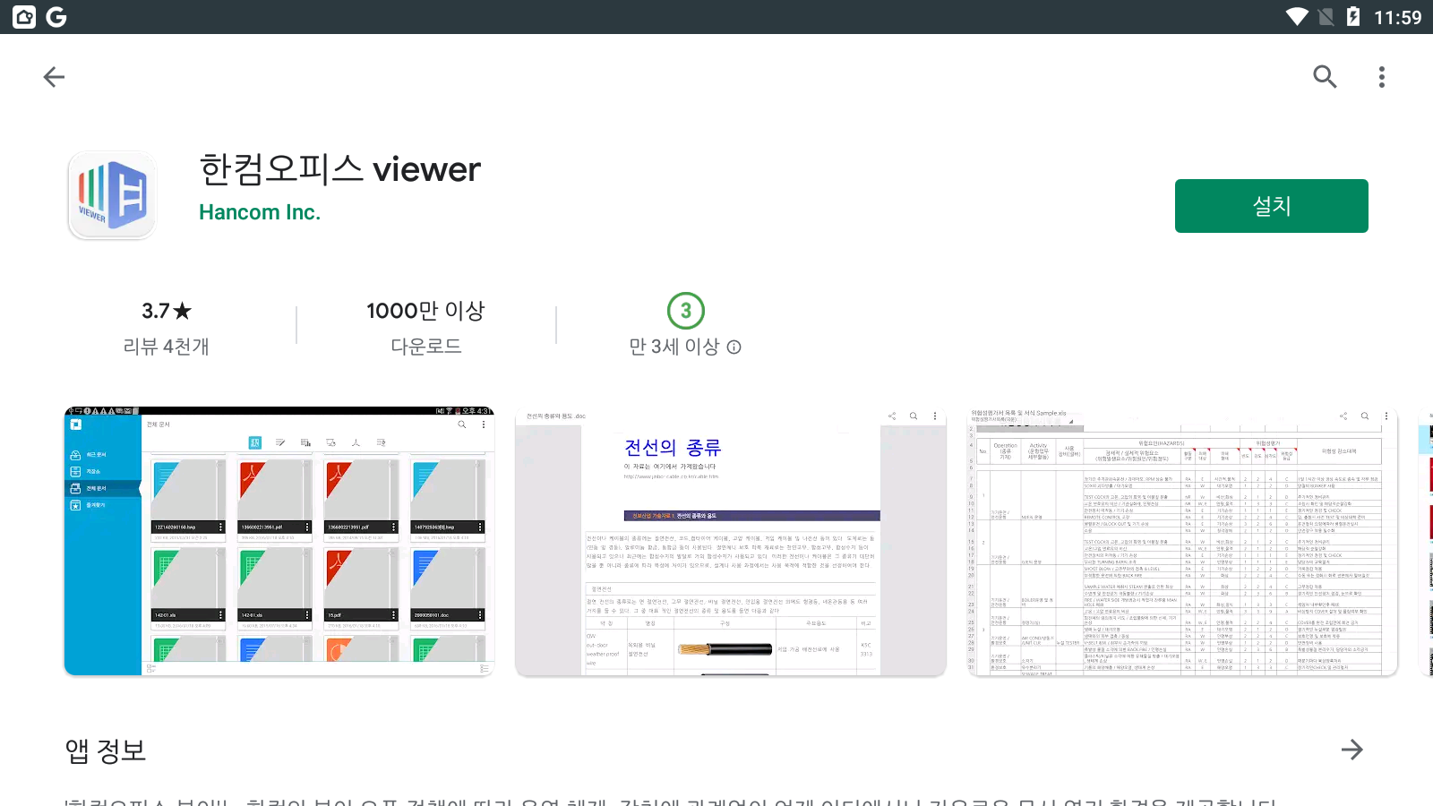 구글 플레이 스토어에서 한컴오피스 뷰어 페이지를 선택합니다. <설치>를 누릅니다.