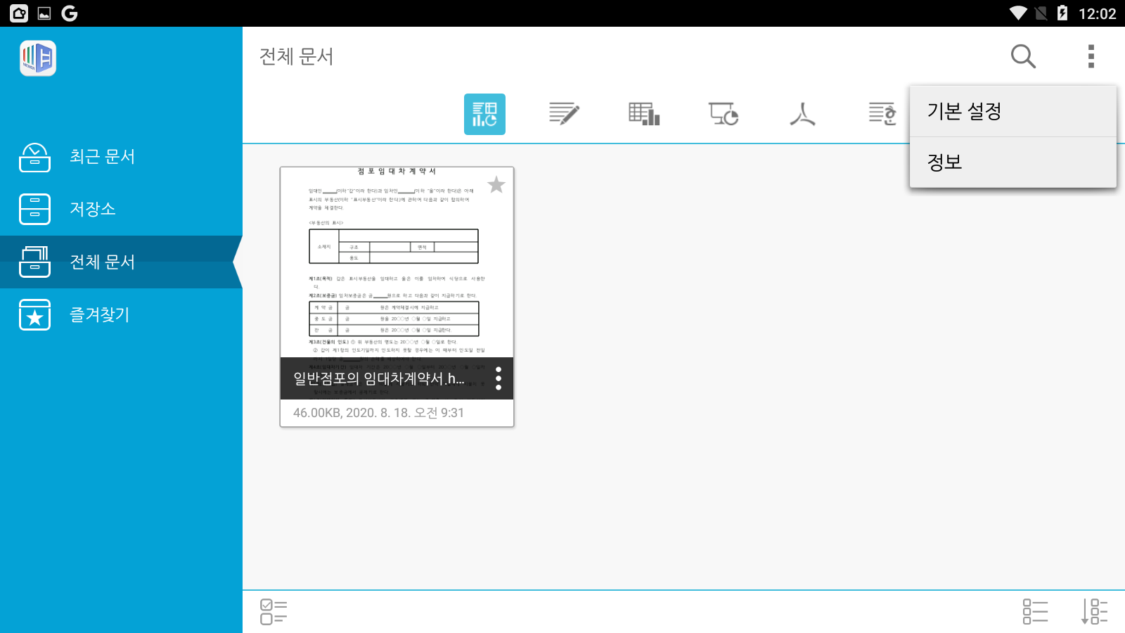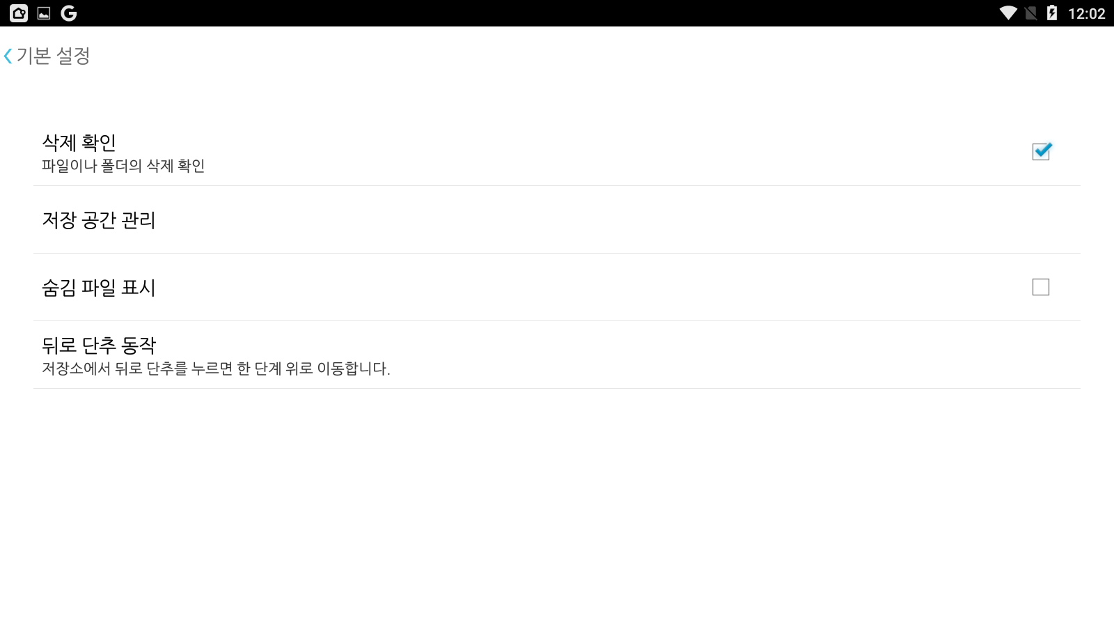 한컴오피스 뷰어(Viewer)의 기본 설정입니다. 삭제 확인, 저장 공간 관리, 숨김 파일 표시, 뒤로 단추 동작의 설정이 가능합니다.