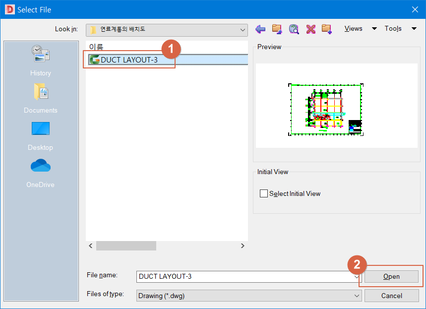 1번 DWG 파일을 선택하고, 2번 <Open>을 누릅니다.