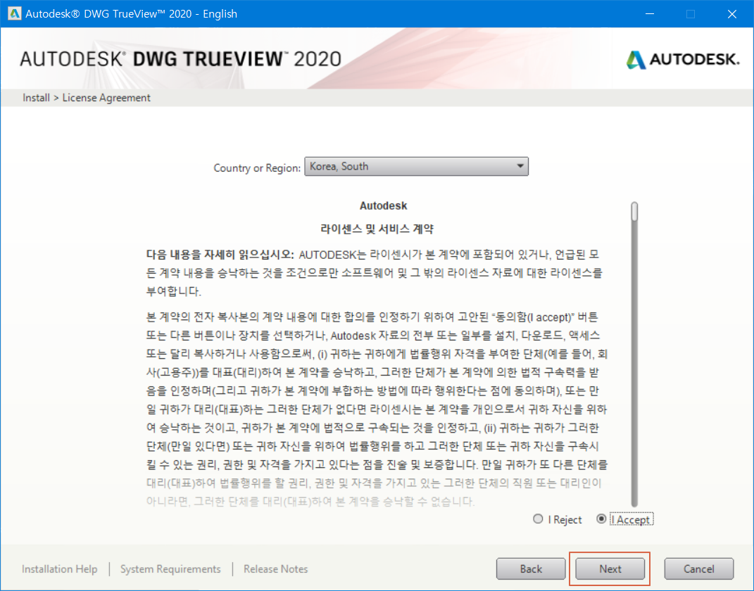 라이선스 및 서비스 계약에 동의를 하면 Next 버튼이 활성화되며 <Next>를 눌러줍니다.