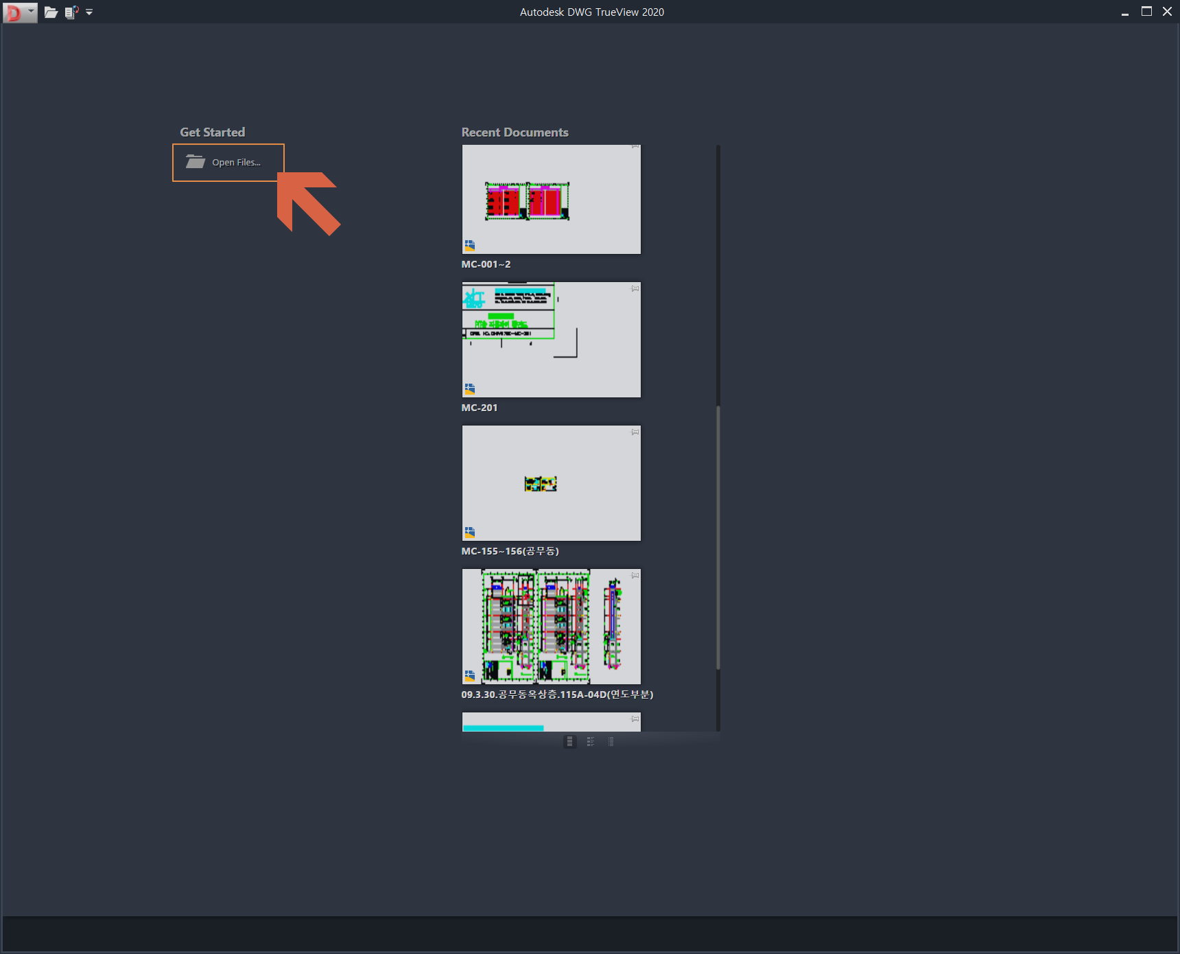 이제 DWG 캐드 파일을 열어보아야겠지요. <Open Files...>을 누릅니다.