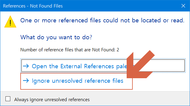 참조 파일 위치가 변경되었다고 나오네요. <Ignore...>를 눌러줍니다.