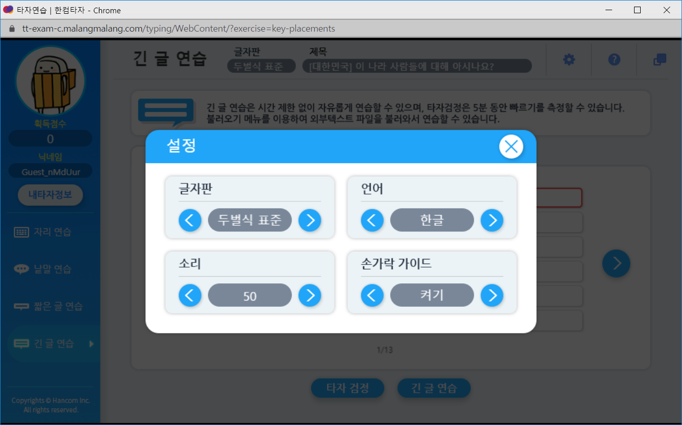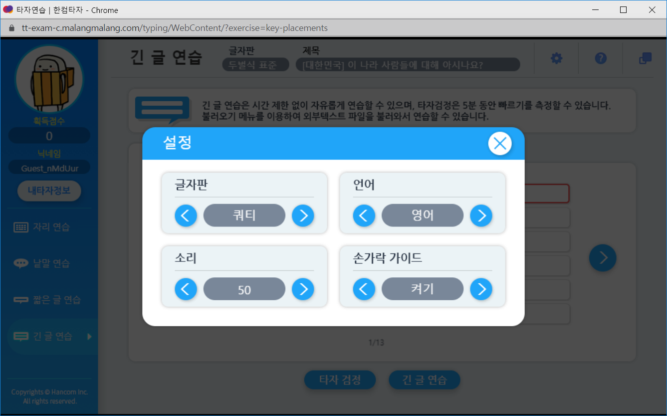 설정은 간단합니다. 글자판과 언어, 소리, 손가락 가이드를 끄고 켜기 할 수 있으며, 영문과 한글 타자연습을 할 수 있도록 설정이 가능합니다.