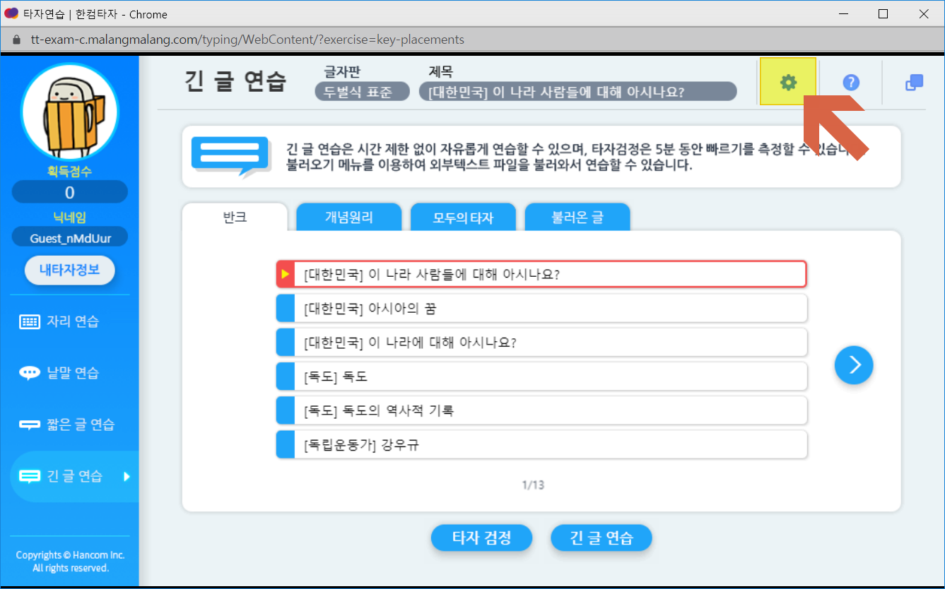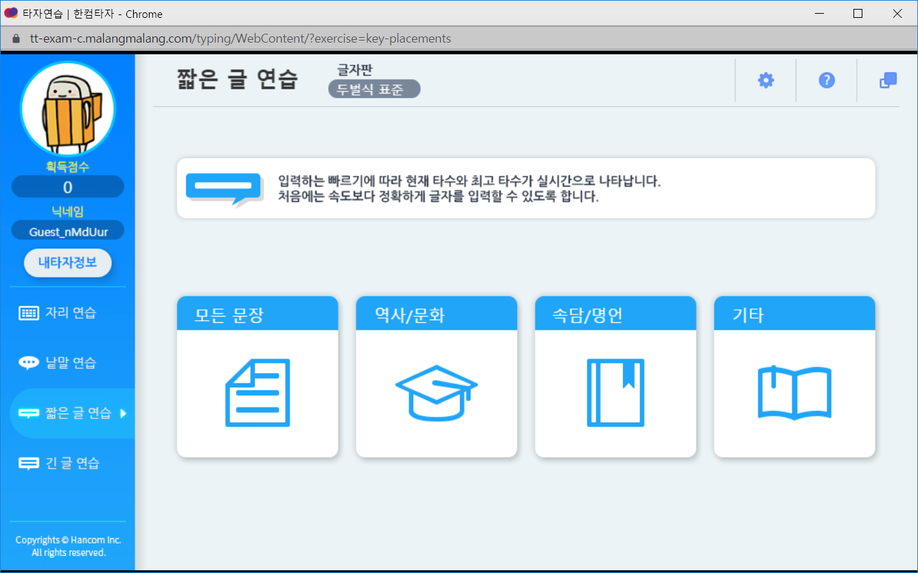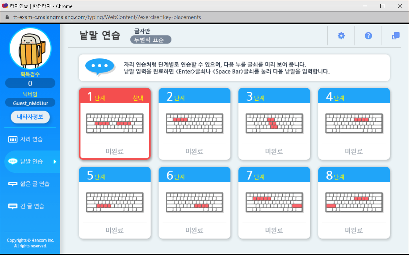 새로운 창이 열리면서 한컴 타자연습이 모습을 드러냅니다.