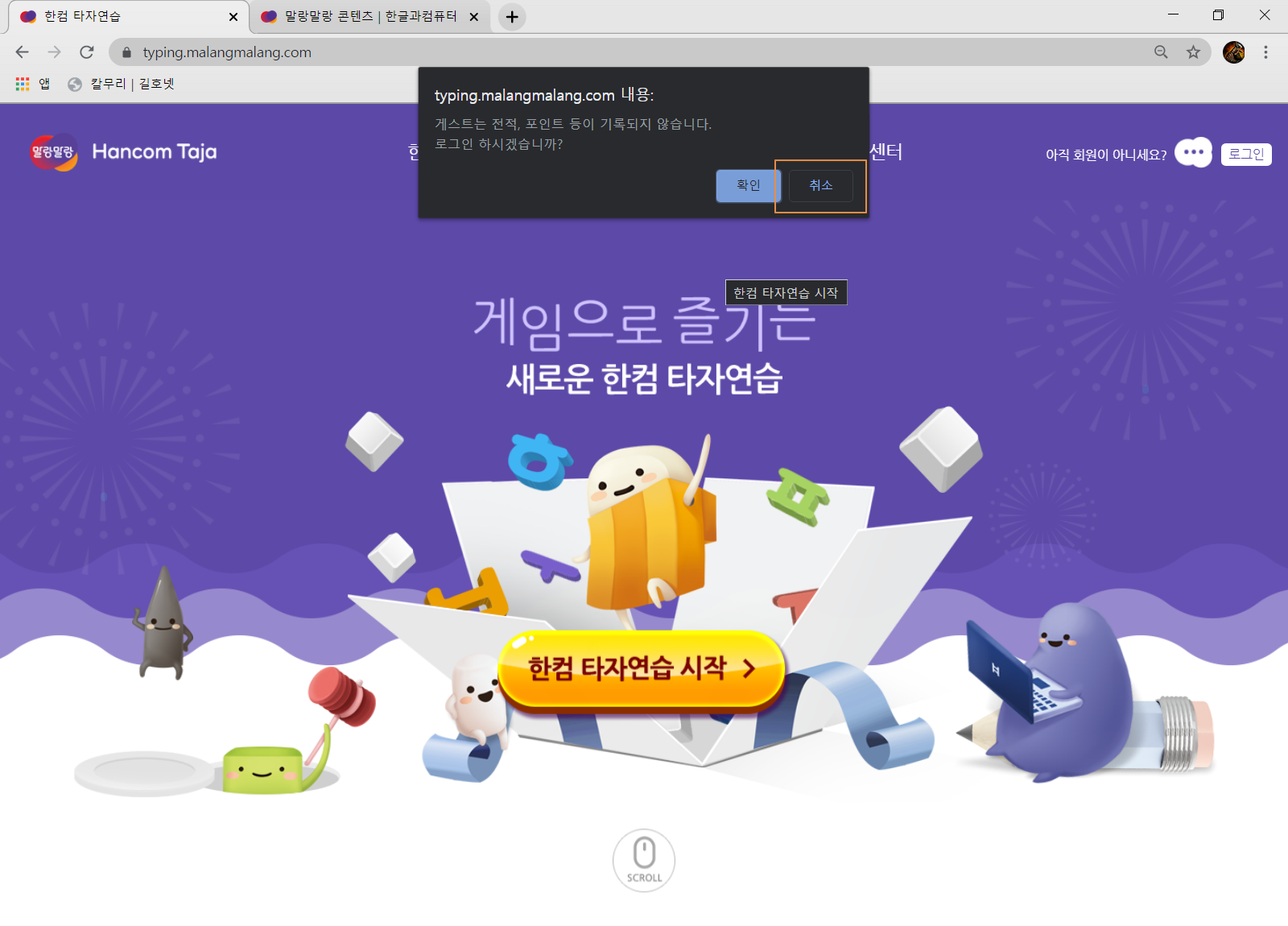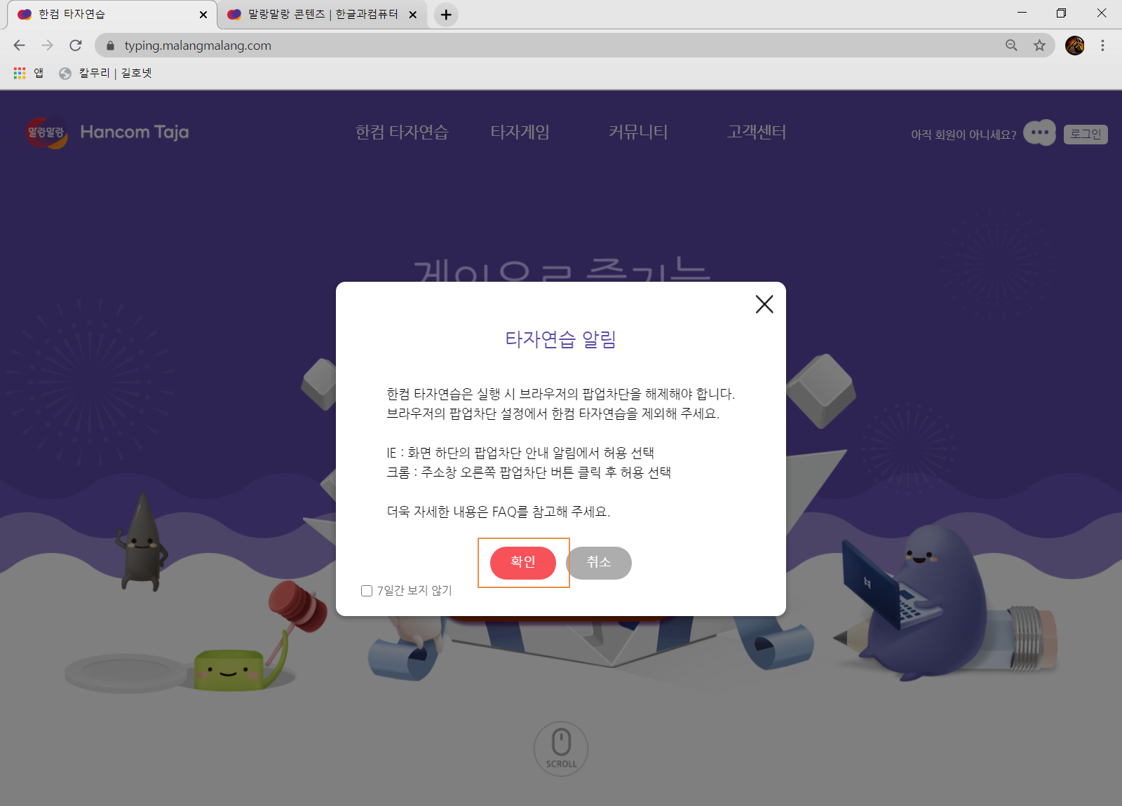 웹에서 실행되기때문에 한컴 타자연습을 사용하려면 브라우저의 팝업 차단의 해제가 필요합니다.