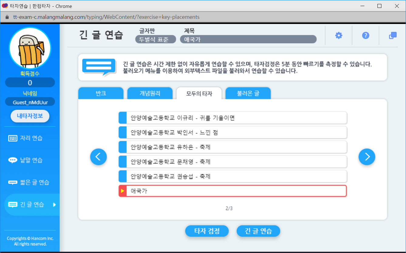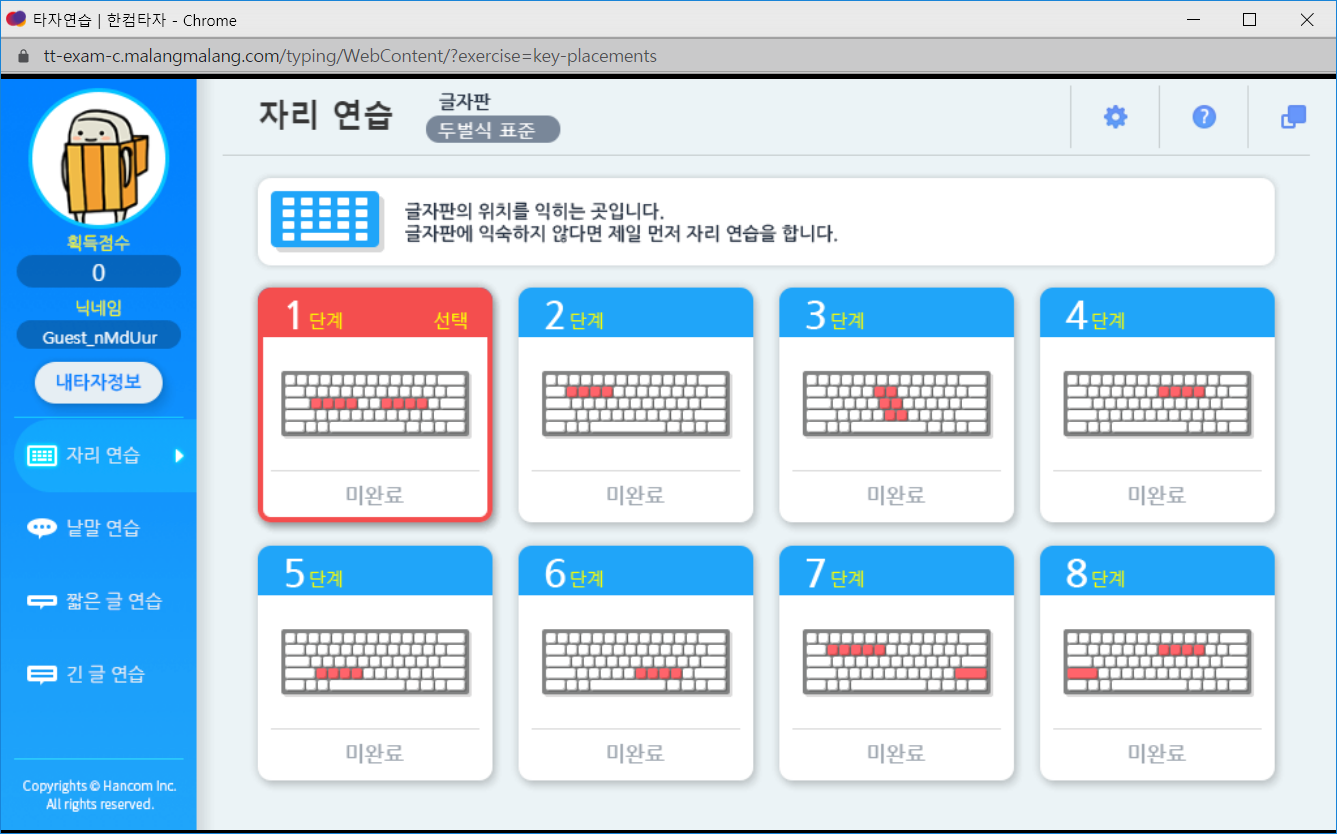 로그인 없이 게스트로 참여하면 전적이나 포인트 등이 기록되지않습니다. 새로 키보드 사용을 배우는 아이들 같은 경우는 로그인하여 기록을 쌓아가면서 모니터링하는 것도 나쁘지 않지만 가끔 연습 삼아 들려서 사용할 계획이라면 게스트로 접속하여도 충분하다고 생각됩니다.