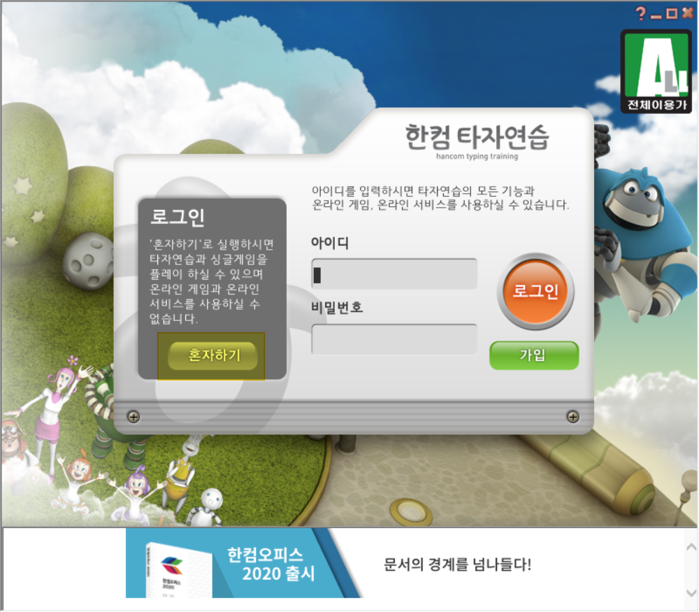 한컴 타자연습을 실행하면 로그인하여 온라인으로 사용자들과 같이 연습을 할 수도 있으며, 혼자 하기를 누르면 컴퓨터와 오프라인에서도 타자연습을 할 수 있습니다. <혼자 하기>를 누릅니다.