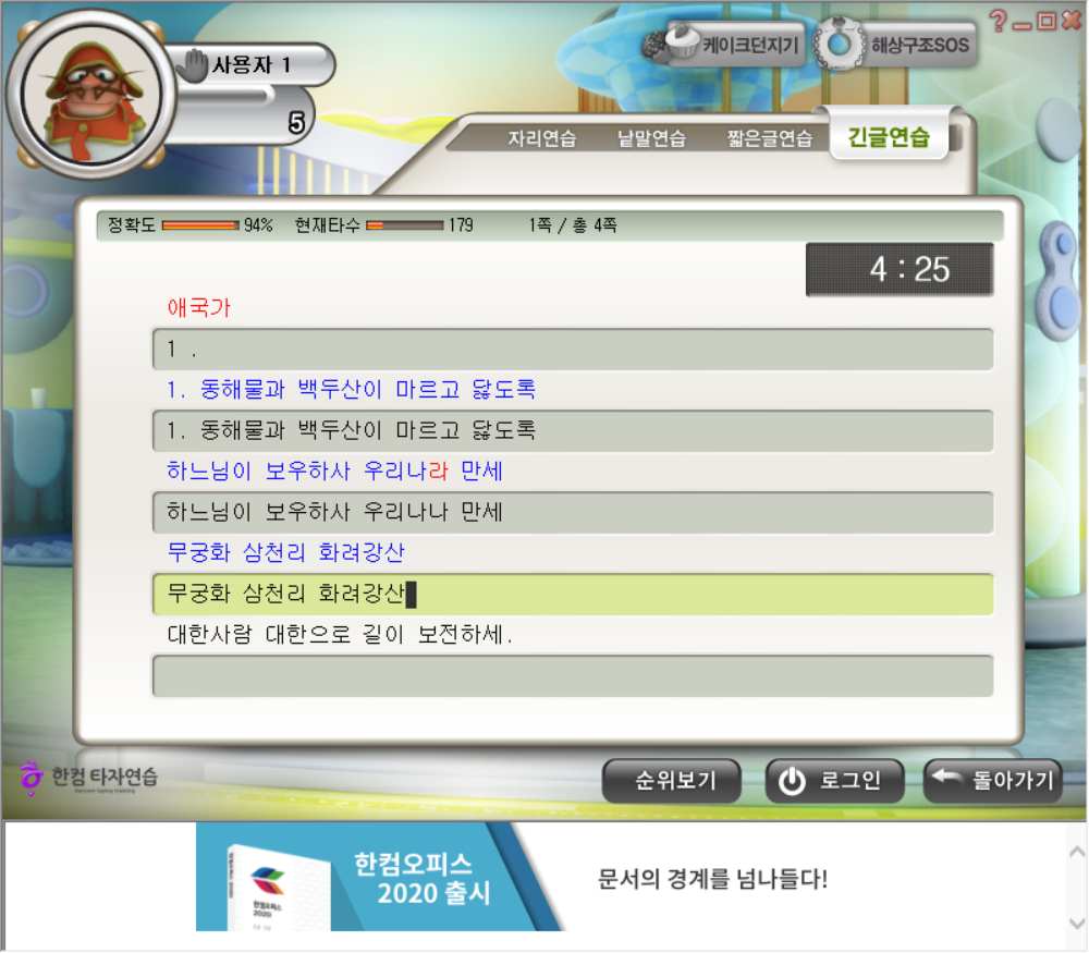 긴 글 연습 메뉴에서 애국가를 찾아보았습니다. 애국가 가사를 본지도 참 오래된 것 같네요.