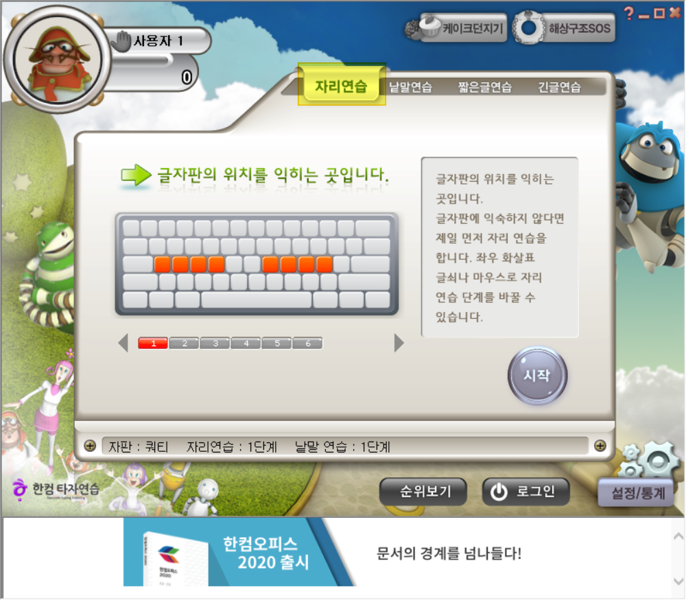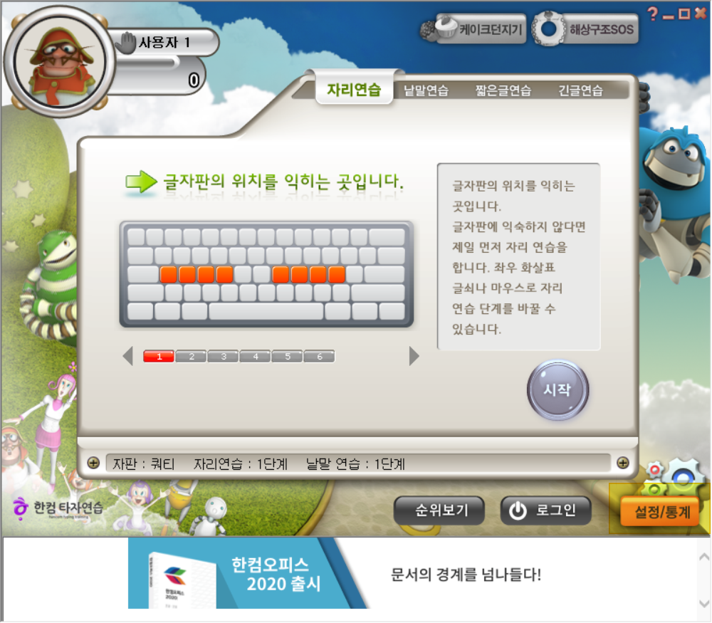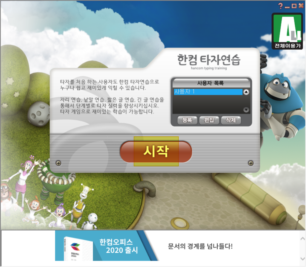 타자를 처음 하는 사용자도 한컴 타자연습으로 누구나 쉽고 재미있게 타자를 익힐 수 있습니다. <시작>을 누릅니다.