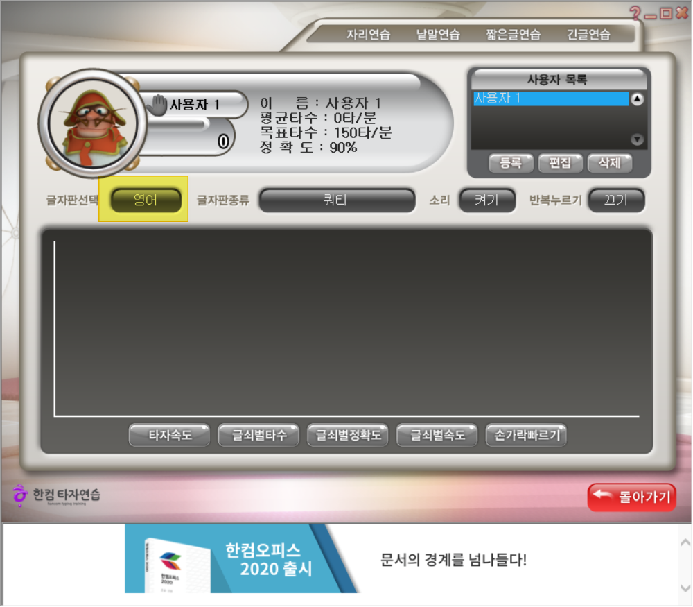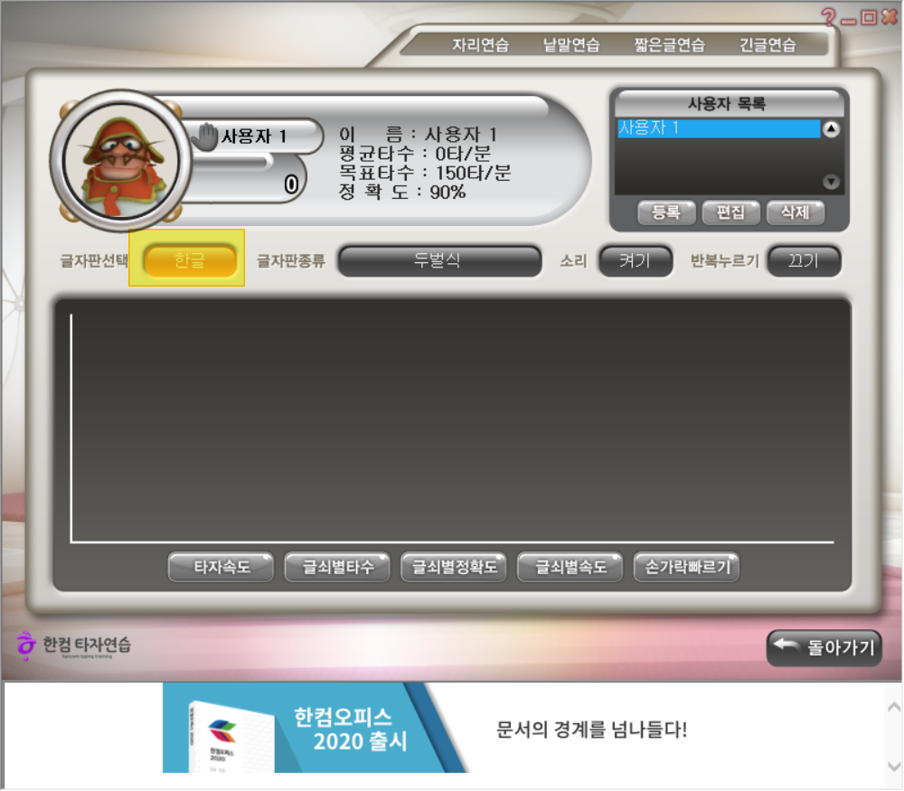 글자판이 <한글>로 변경되었습니다. 그 외에도 글자판의 종류, 소리 켜기/끄기, 반복 누르기 등의 설정이 가능하며, 타자 속도, 글쇄별 타수, 정확도, 속도, 손가락 빠르기의 통계 기록을 확인할 수 있습니다.
