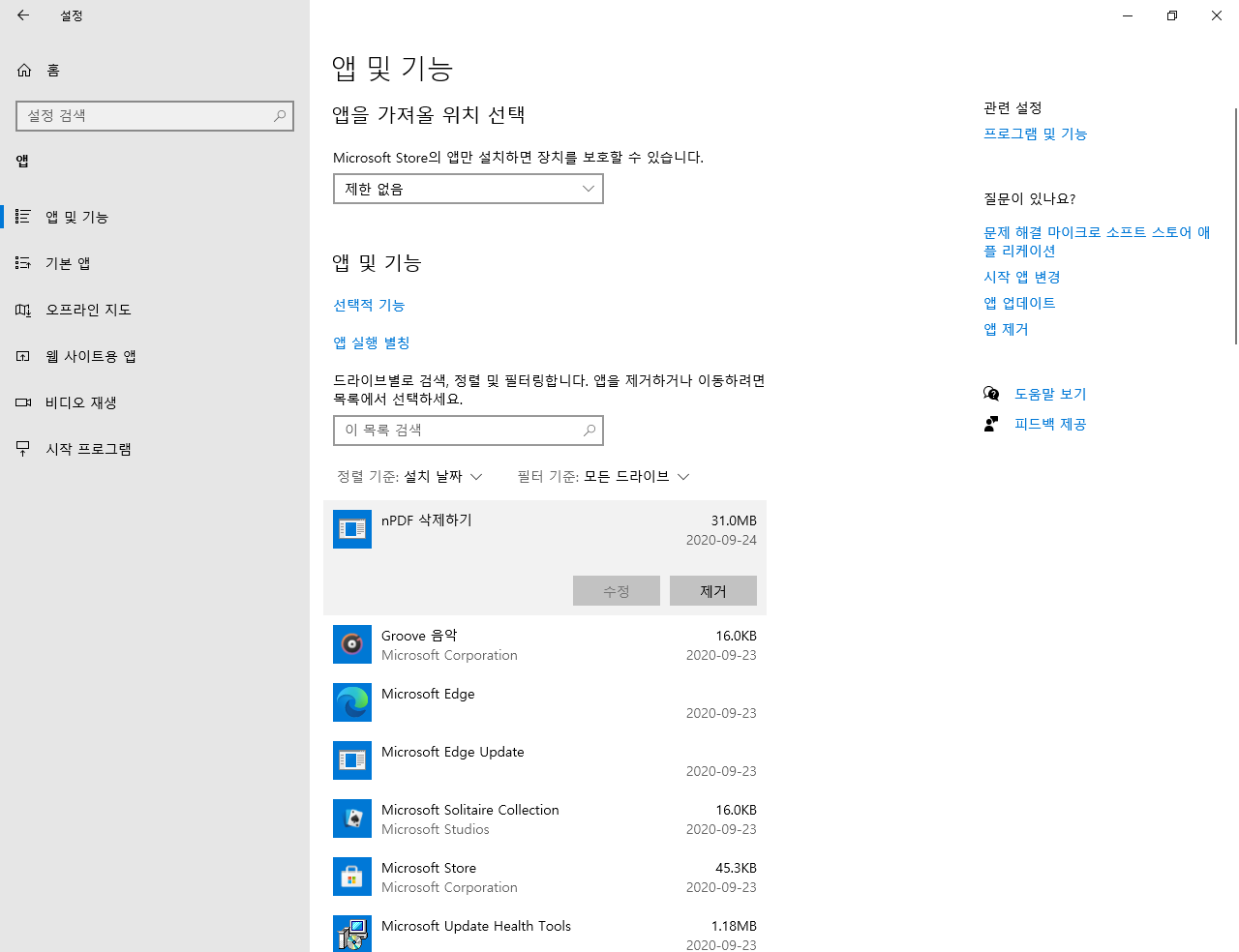 앱 설치 및 제거를 설치 날짜를 기준으로 살펴보니 nPDF만 있습니다. 역시 바탕화면에 꿈해몽과 가요 팝송은 바로가기만 삭제하면 되는 것 같습니다.