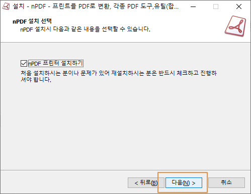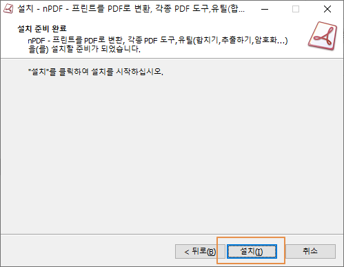 nPDF의 설치가 완료되었습니다. <완료>를 누릅니다.