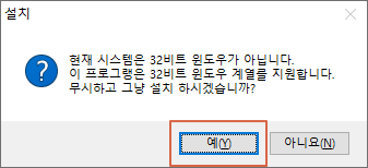 32비트 프로그램이므로 무시하고 그냥 설치를 해야 합니다. <예>를 누르세요.