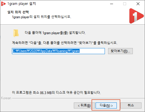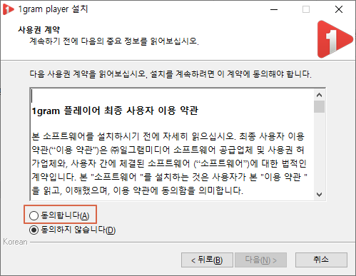1그램 플레이어(1gram Player) 약관에 동의하여야만 설치가 진해됩니다. <동의합니다>에 체크를 합니다.