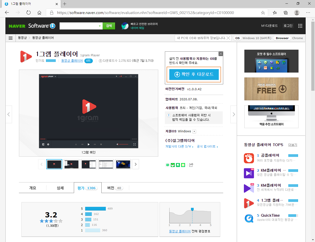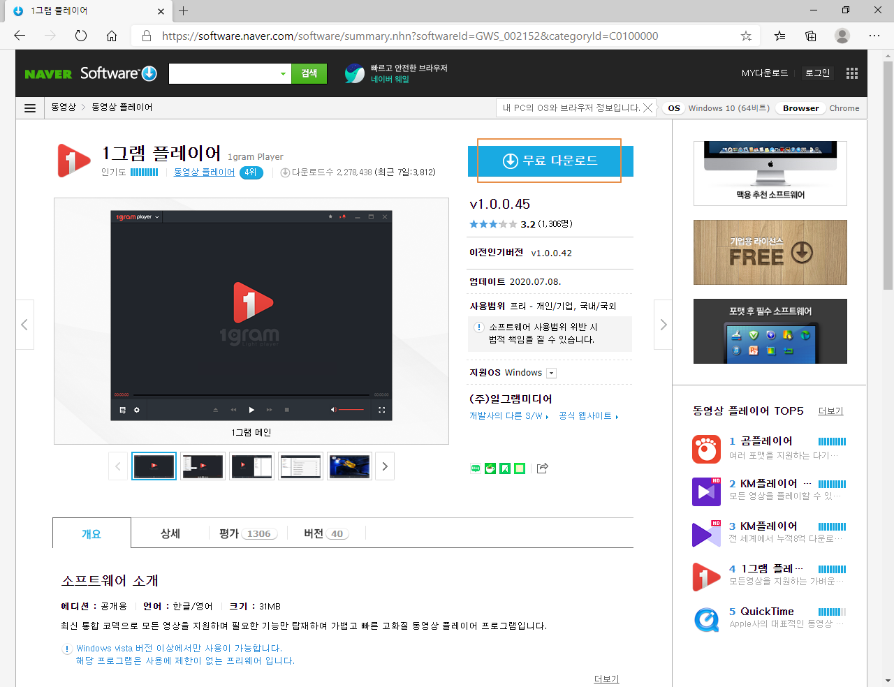 1그램 플레이어(1gram Player) 다운로드 사이트로 접속합니다. <무료 다운로드>를 누르세요.
