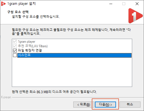 1그램 플레이어 사용하는데 관계없는 시스인포라는 프로그램이 설치될 수 있으므로 체크를 해제합니다.