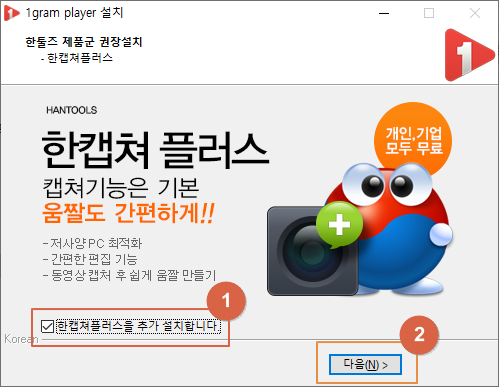 이번엔 한캡쳐플러스라는 프로그램이 설치되려 합니다. 물론 좋은 프로그램이긴 한데 1그램 플레이어하고 관계가 없으므로 일단 <한캡쳐플러스를 추가 설치합니다>에 체크를 해제하고, <다음>을 누릅니다.