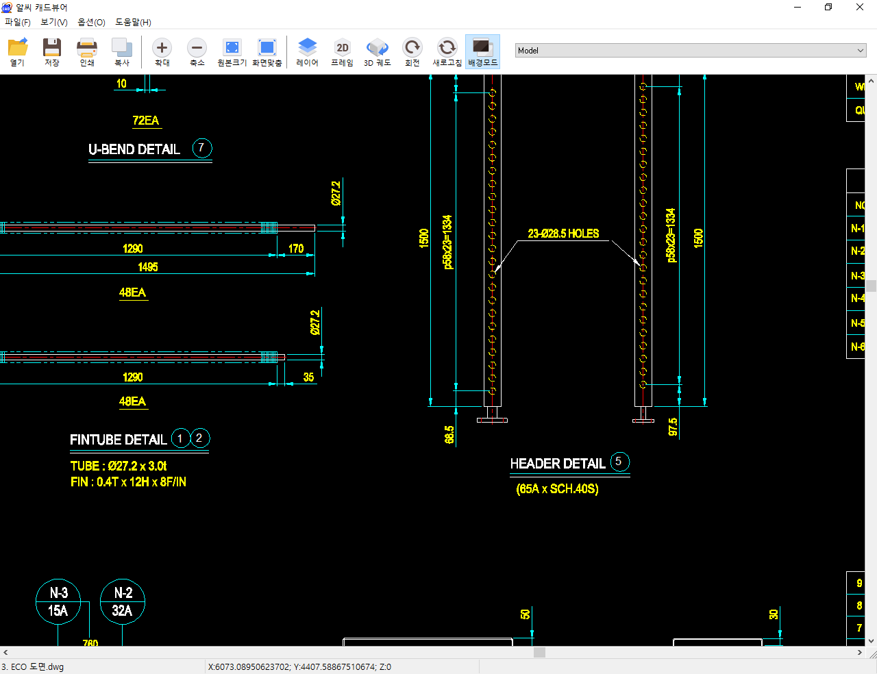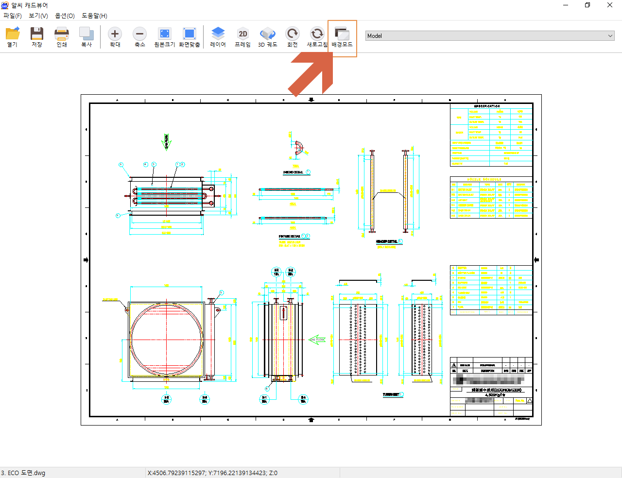DWG 형식의 도면 파일이 정상적으로 열렸습니다. 바탕이 백색이라서 가독성이 떨어지는군요. <배경 모드>를 눌러볼까요?