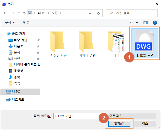 DWG 파일을 선택 후 <열기>를 누릅니다.