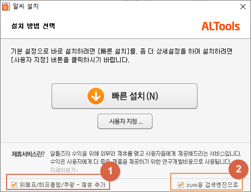 <위메프/하프클럽/쿠팡 - 제휴 추가>를 체크 해제한 후 <zum을 검색엔진으로>도 체크 해제합니다. 시작페이지와 광고가 뜨기 때문에 나중에 조금 귀찮아질 수 있어 제외하도록 하겠습니다.