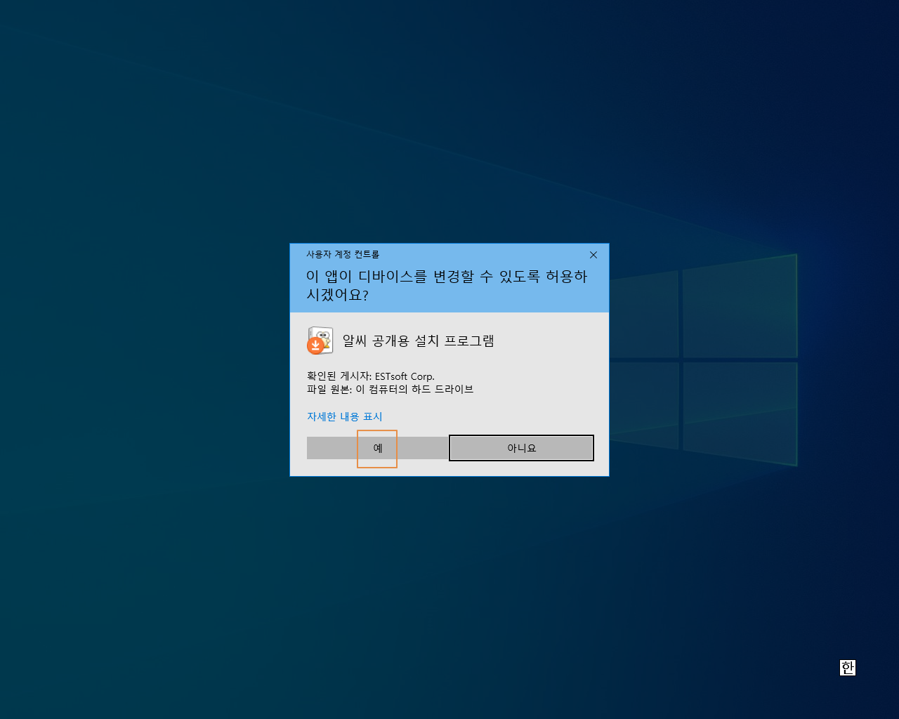 사용자 계정 컨트롤 창이 열리면 <예>를 누릅니다.