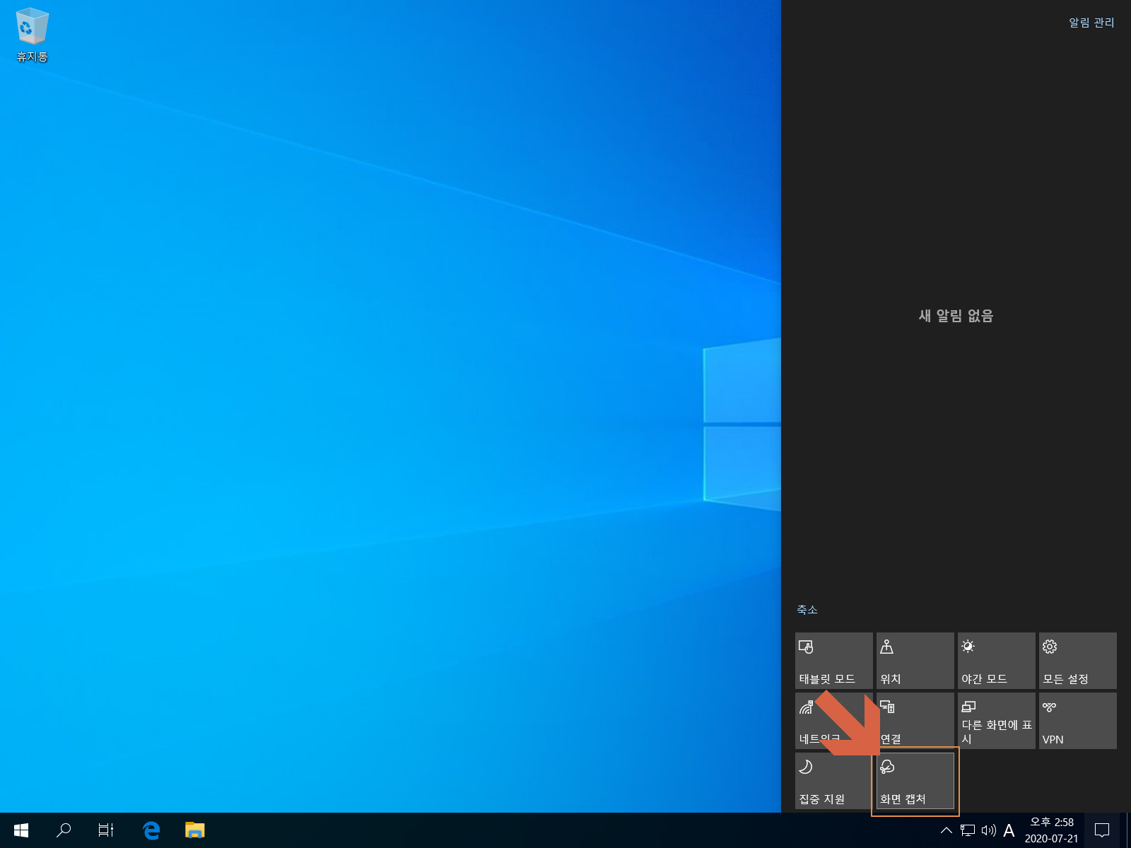 컴퓨터 화면 캡쳐, 윈도우10 기본 프로그램 활용을 위해서는 먼저 알림 센터를 클릭합니다.
