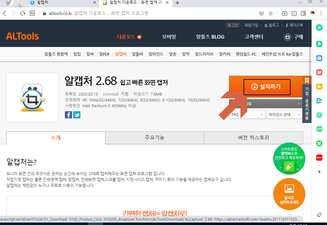 알툴즈 홈페이지의 알 캡처 다운로드 사이트로 이동합니다. <설치하기>를 선택합니다.