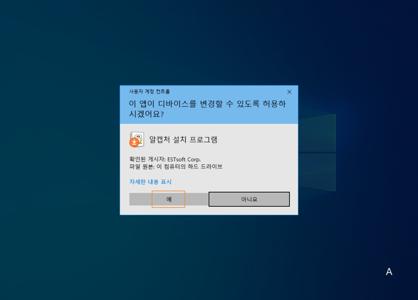 사용자 계정 컨트롤입니다. <예>를 누릅니다.