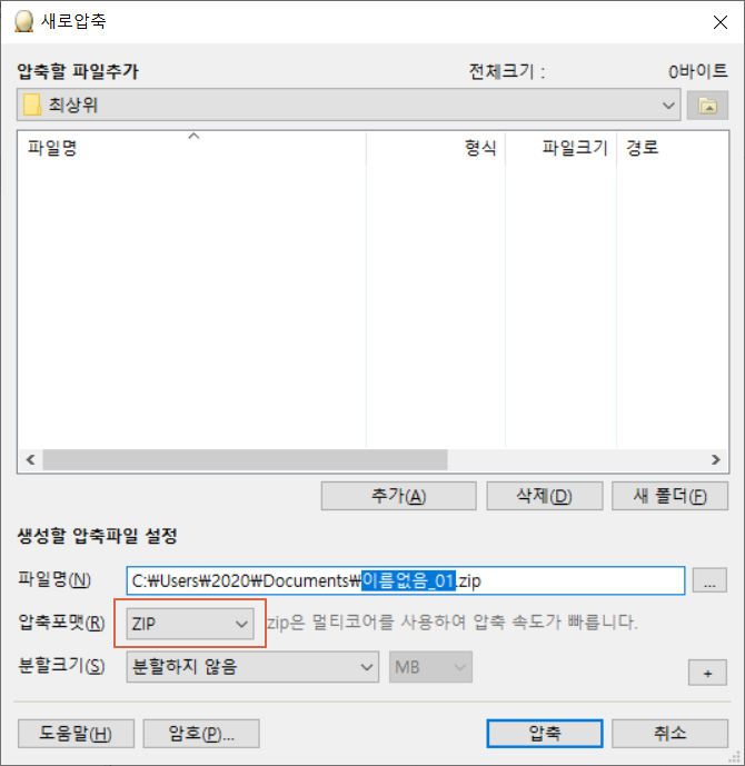 압축포맷의 <ZIP>를 누릅니다.