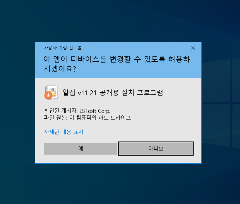 알집 설치 파일이 디바이스를 변경할 수 있도록 허용이 필요하며, <예>를 누릅니다.