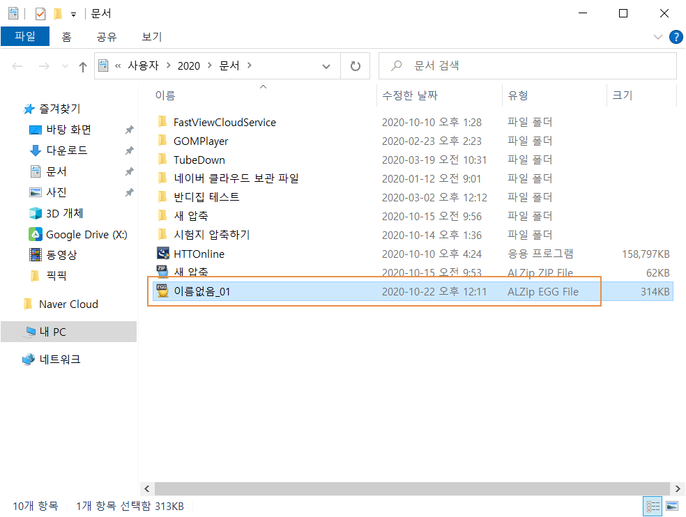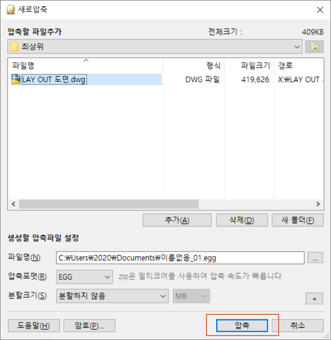 위에서 설정한 폴더와 파일명으로 알집 고유 포맷인 EGG 파일로 압축 파일이 생성되었습니다.